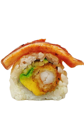 Gefrituurde garnaal, en avocado,sla, mayo,unagi